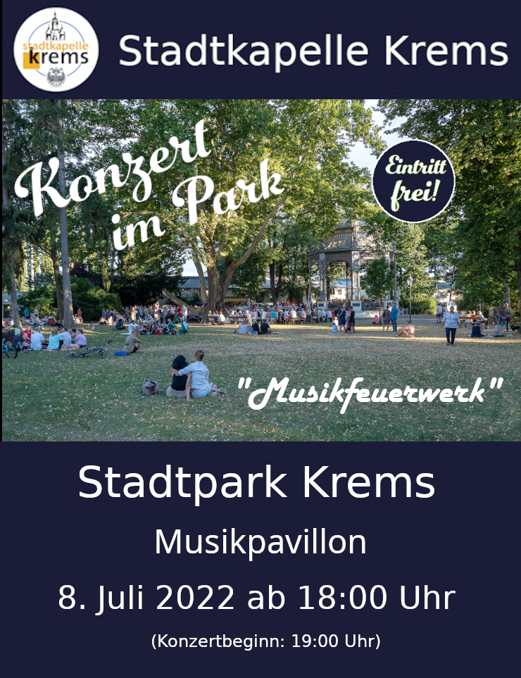 Am 8. Juli 2022 ab 18:00 Uhr lud die Stadtkapelle Krems nach 2-jähriger Corona bedingten Pause bei freiem Eintritt wieder zum "Konzert im Park" ein. Bei traumhaftem Ambiente im Kremser Stadtpark konnten wir sie in gewohnter Weise musikalisch verwöhnen.