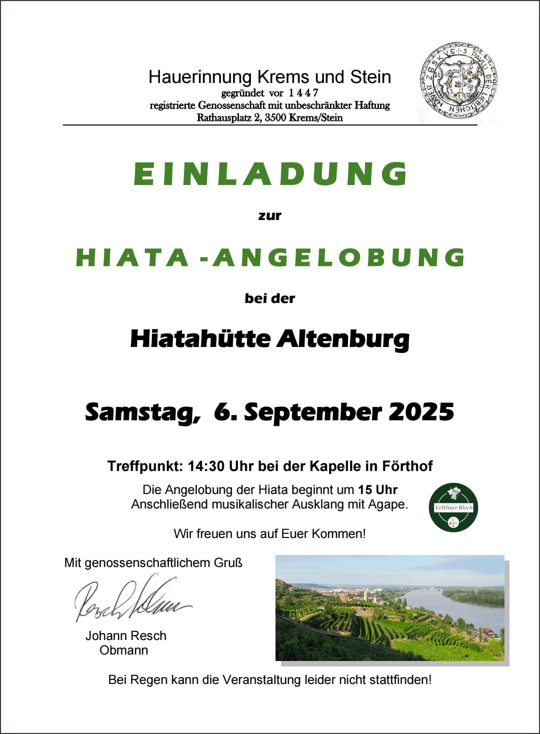 Am 06.09.2024 lädt die Hauerinnung Krems-Stein anlässlich der Hiata Angelobung zu einem Fest mitten in den Kremser Weinbergen. "Veltliner Blech", das Brass Ensemble der Stadtkapelle Krems ist dabei und darf den feierlichen Akt und das anschließende Fest musikalisch umrahmen.