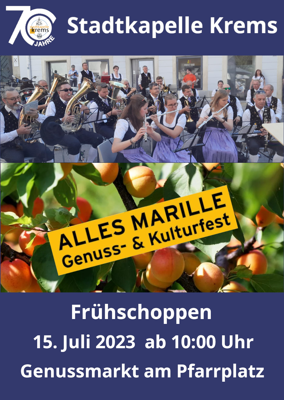 Am Samstag dem 15.07.2023 ab 10:00 Uhr spielte die Stadtkapelle Krems am Kremser Pfarrplatz, wo auch der "Genussmarkt" stattfand, einen Frühschoppen. Derer Wettergott hat es mit uns gut gemeint und wir konnten zahlreiche Besucher mit unseren musikalischen Darbietungen erfreuen .